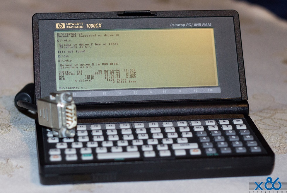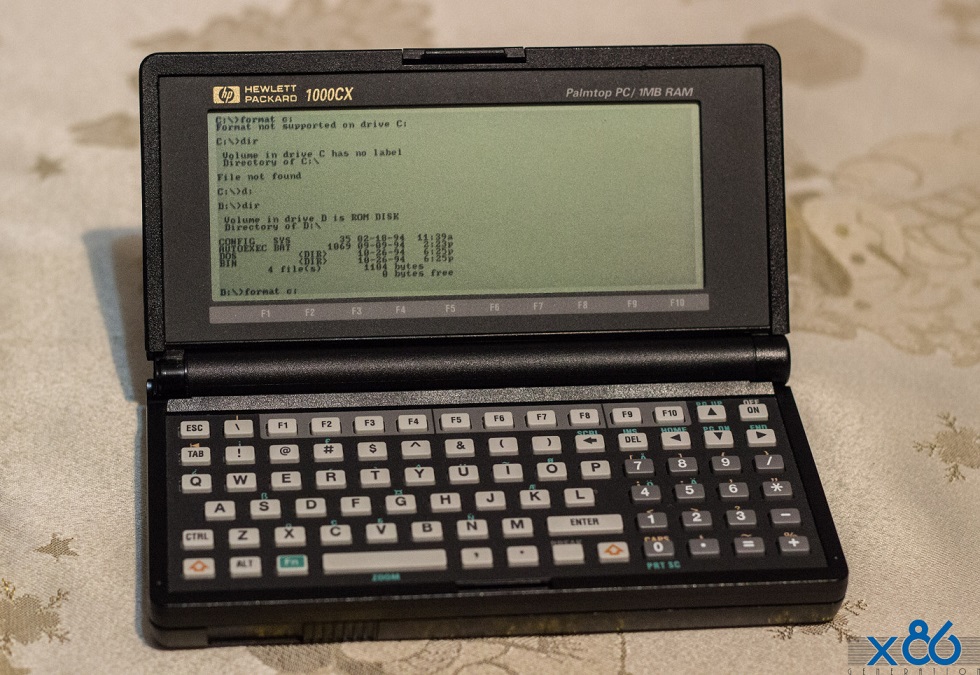 The HP 1000CX has an Intel 80186 compatible embedded CPU named “Hornet”, which runs at ~7.91 Mhz and has 1, 2 or 4 MB of memory, of which 640 KB is RAM and the rest can be used for expanded memory (EMS) or memory-based storage space.