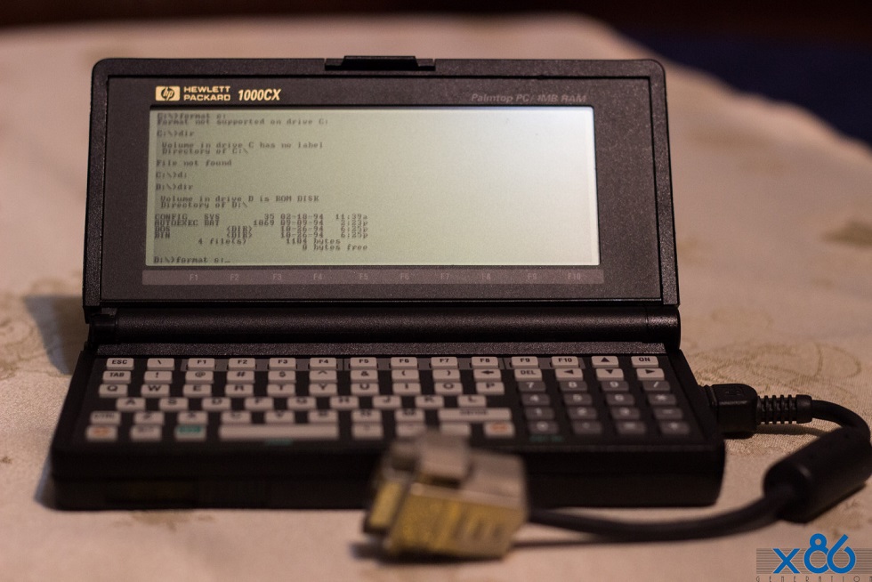 Being IBM PC/XT compatible and running MS-DOS 5.0 from ROM, the HP 1000CX can run virtually any program that would run on a full-size PC compatible computer as long as the code is written for the Intel 8086, 8088 or 80186 CPU and can run using CGA graphics. It can also run programs written for the 80286 CPU, provided they do not require the use of protected mode. It has a 16-bit PCMCIA Type II expansion slot that supports 5 V at 150 mA maximum, a SIR compatible infrared port and a full serial port (but with a proprietary mini connector for space constraint reasons).