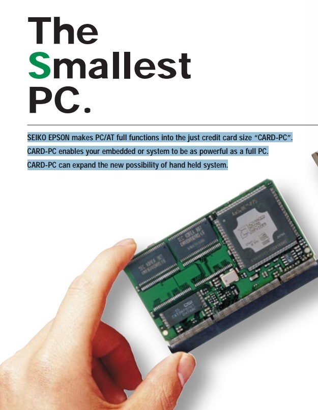 The EPSON PC/486D4 is a complete computer minus the storage as it has an integrated processor containing a CPU, DRAM, flash BIOS EEPROM, I/O ports, video controller and other functions of a PC motherboard in a compact unit measuring a mere 86x54x7.5mm