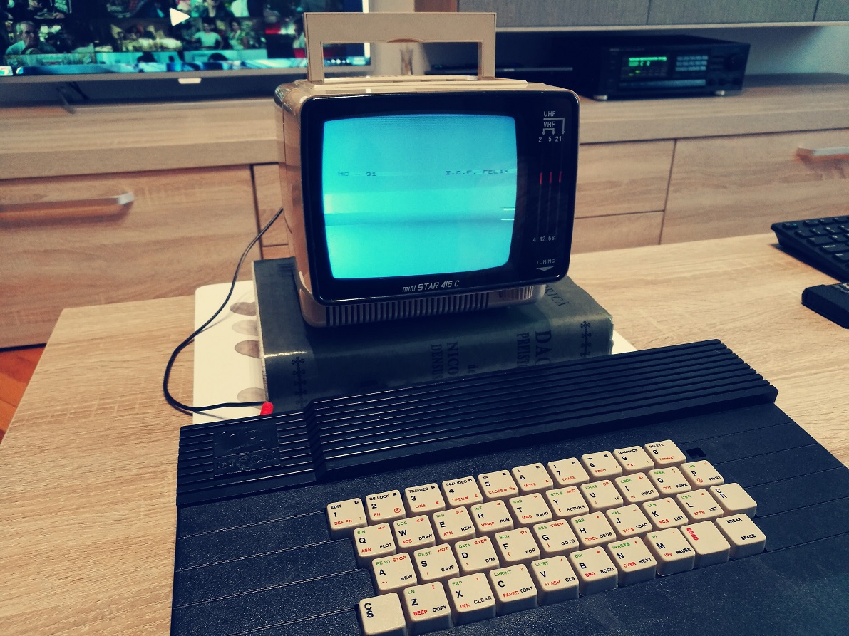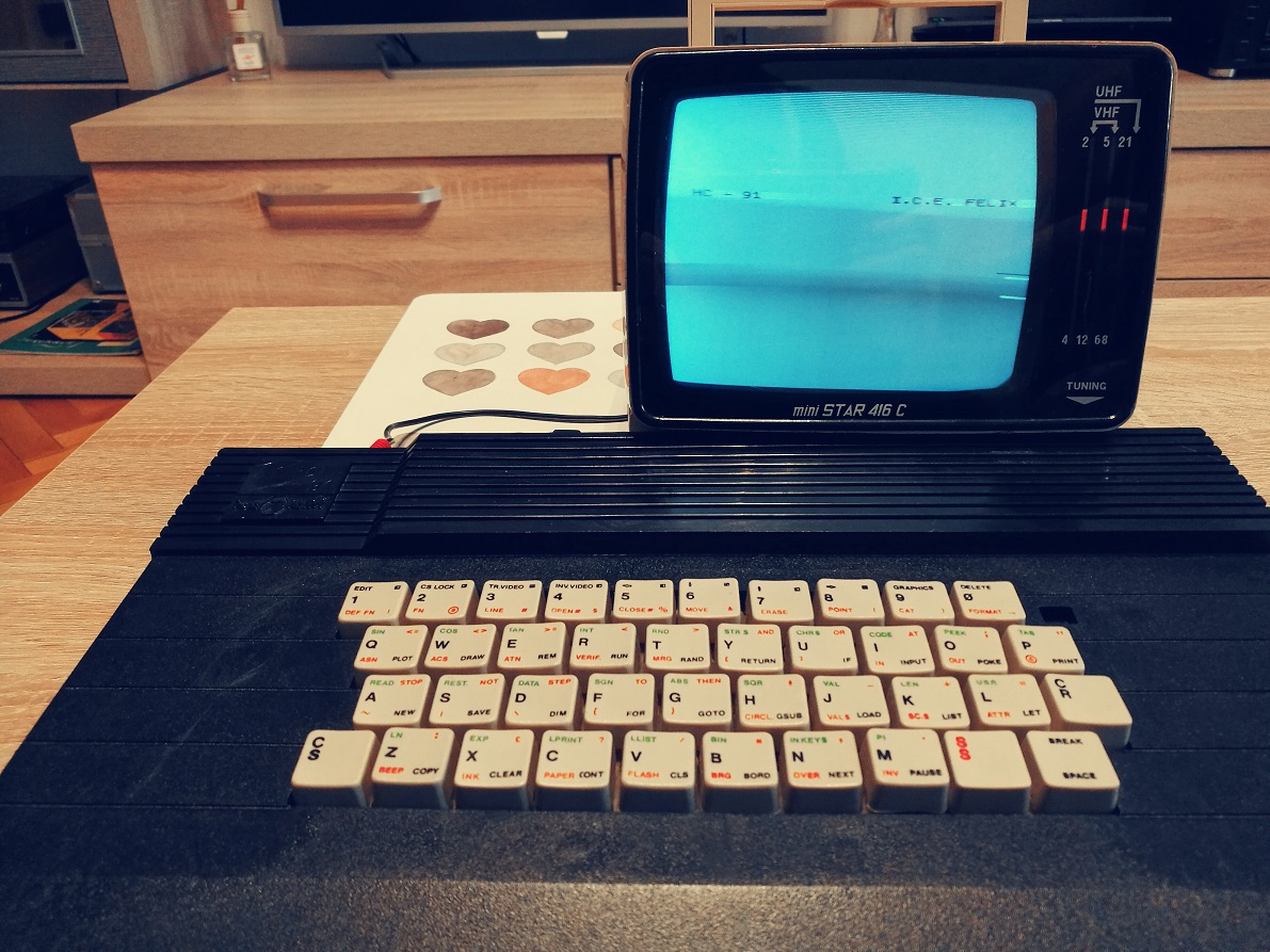 HC91 is running the BASIC (Spectrum Basic interpreter). The graphic module cand handle up to 256 X 192 pixel, 16 colors and it uses a tape drive for the loading and saving the data