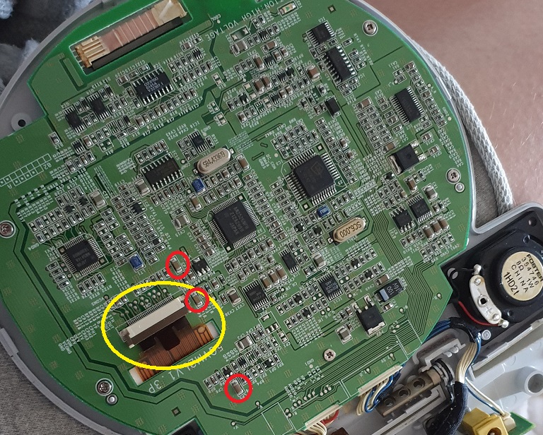 It seems there was something sticky dropped at some point on the display. On the back of the LCD the yellow marked ribbon cable was very sticky and the 3 marked capacitors were dead. i had cleaned everything using isopropylic alcohol and decided to change the bad SMD caps.
